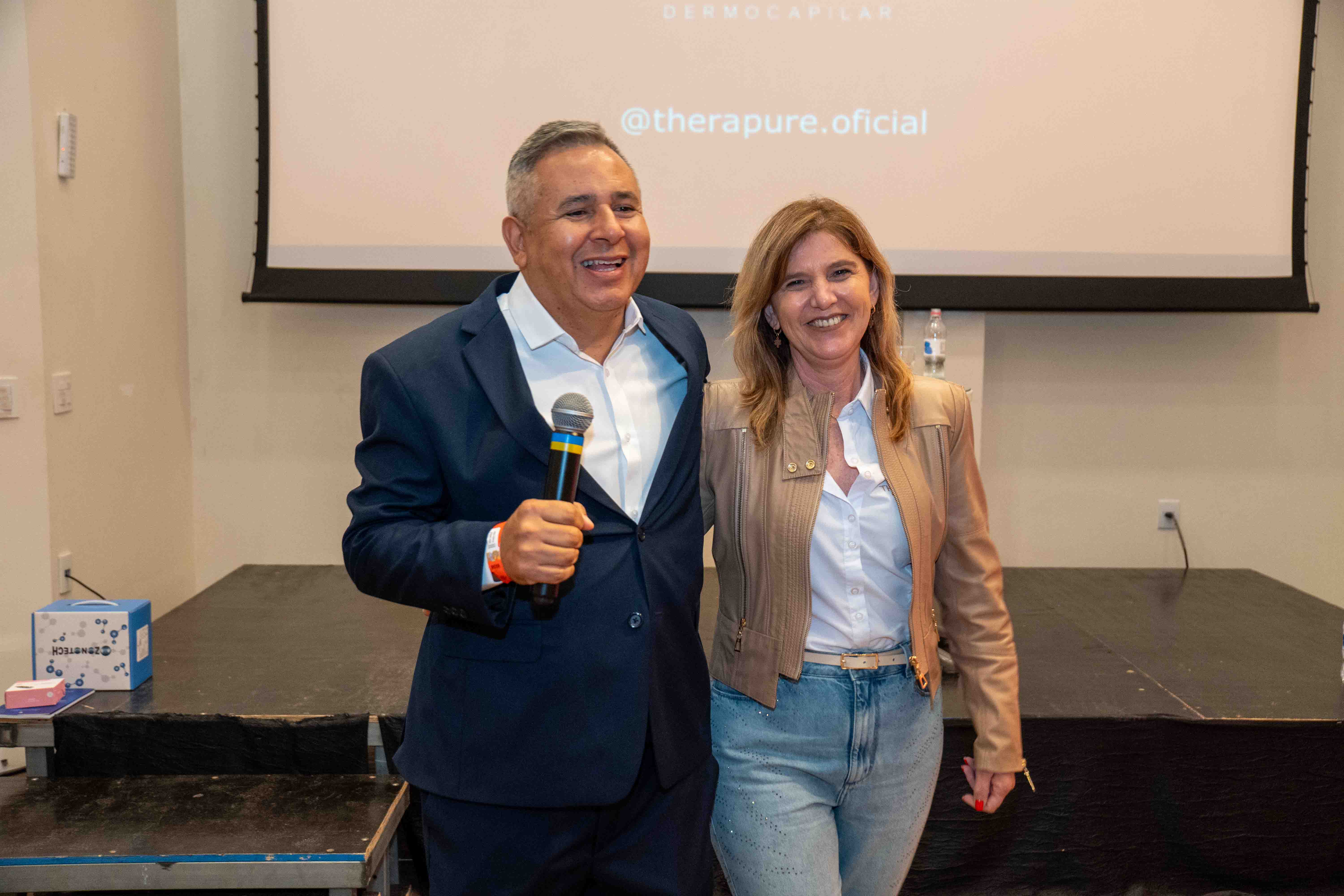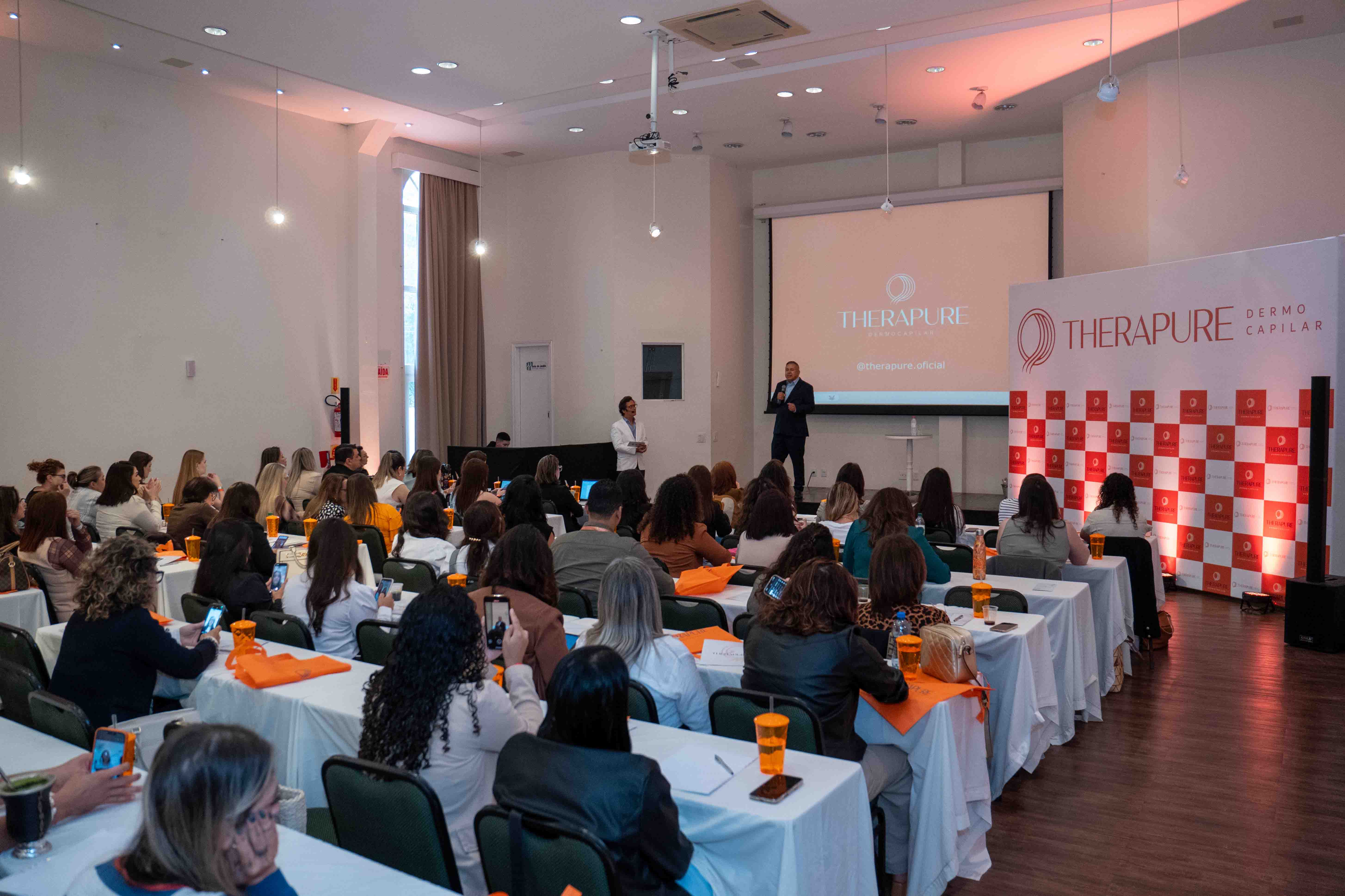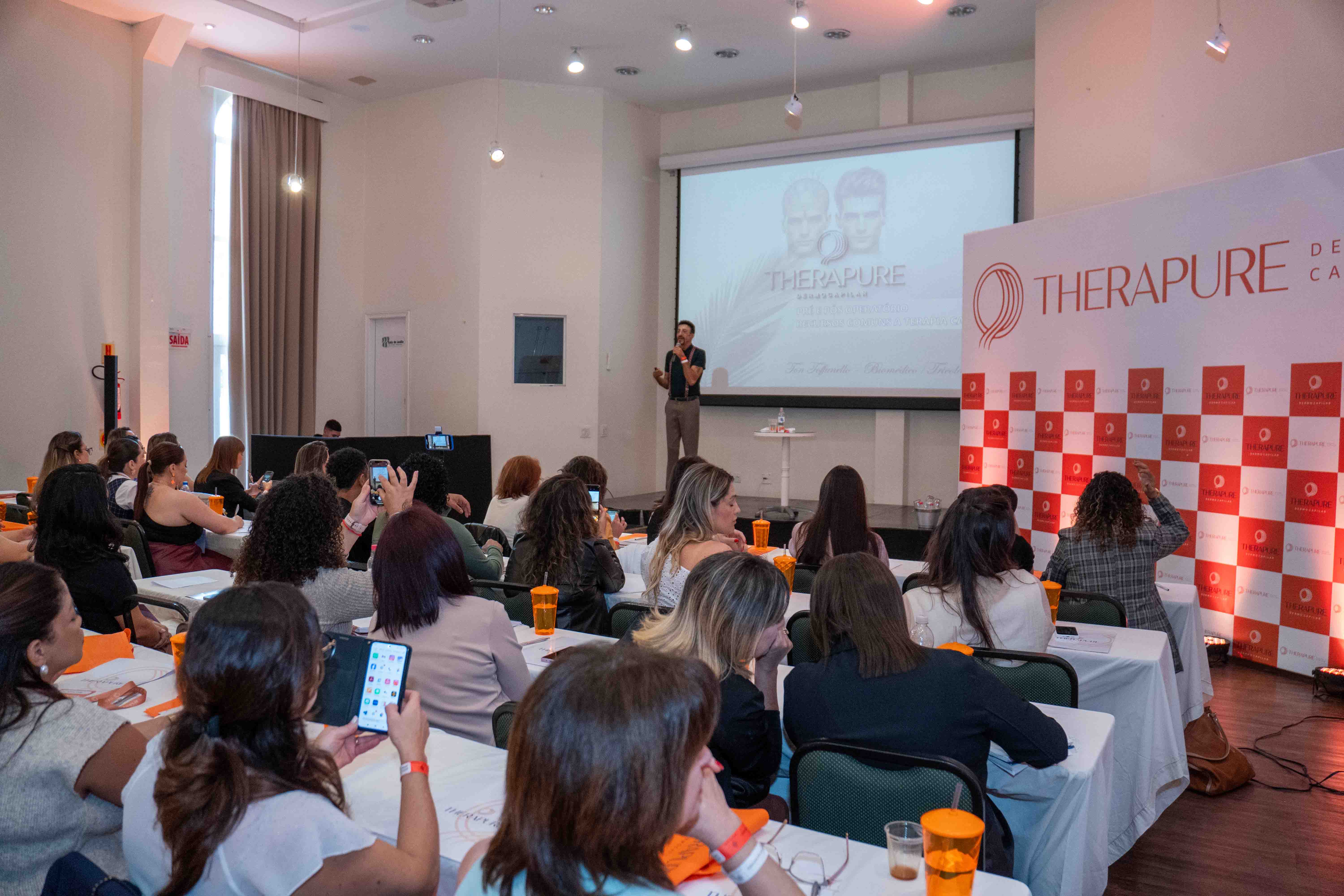 O CEO da Therapure Dermocapilar, Evandro Machado, deu início ao evento compartilhando sua trajetória e visão sobre gestão, vendas e construção de marca dentro do mercado dermocapilar. Sua apresentação reforçou o compromisso da Therapure com inovação, qualidade e capacitação profissional.